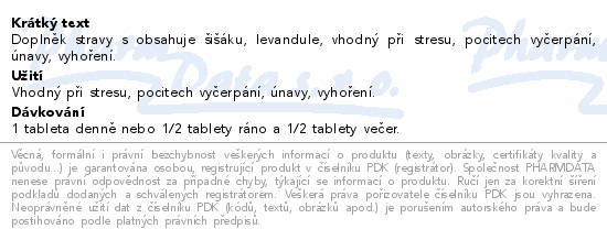 Doplněk stravy s obsahuje šišáku, levandule, vhodný při stresu, pocitech vyčerpání, únavy, vyhoření.