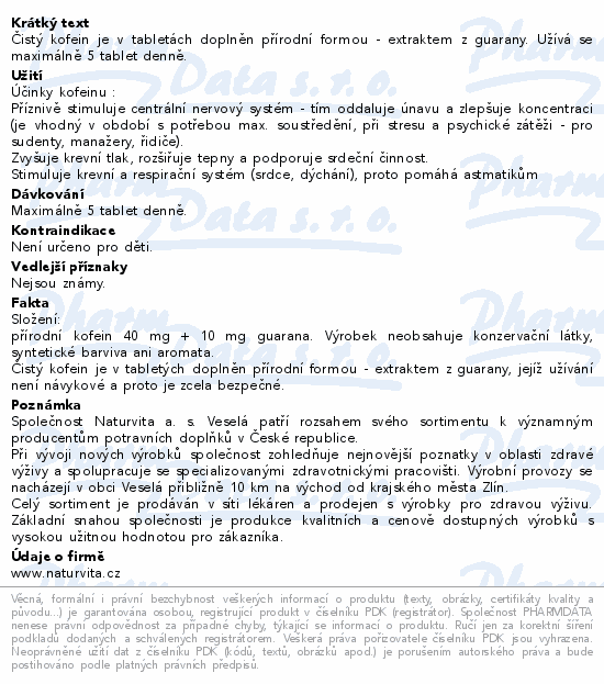 Čistý kofein je v tabletách doplněn přírodní formou - extraktem z guarany. Užívá se maximálně 5 tablet denně.