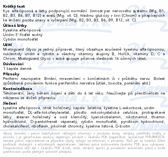 Kys. alfa-lipoová a látky podporující normální: činnost per. nervového systému (Mg, B1, B2, B3, B6, B7, B12) a svalů (Mg, vit. D), hladinu glukózy v krvi (Chrom) a přispívajících ke snížení pocitu únavy a vyčerpání (Mg, B2, B3, B5, B6, B9, B12, vit. C).