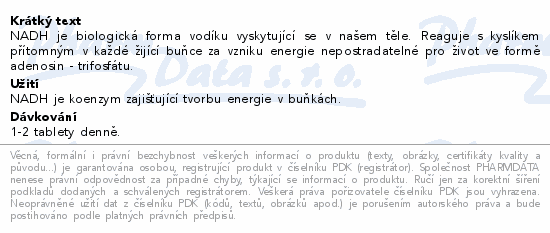 NADH je biologická forma vodíku vyskytující se v našem těle. Reaguje s kyslíkem přítomným v každé žijící buňce za vzniku energie nepostradatelné pro život ve formě adenosin - trifosfátu.