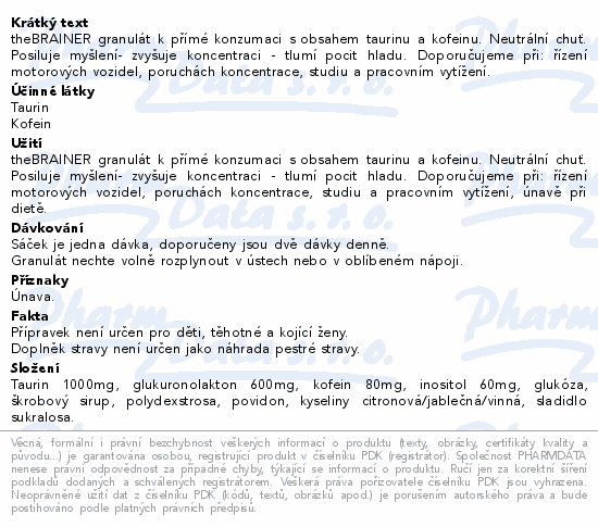 theBRAINER granulát k přímé konzumaci s obsahem taurinu a kofeinu. Neutrální chuť. Posiluje myšlení- zvyšuje koncentraci - tlumí pocit hladu. Doporučujeme při: řízení motorových vozidel, poruchách koncentrace, studiu a pracovním vytížení.