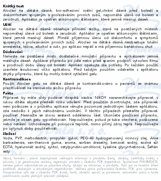 Aloclair na dětské dásně, bio-adhezivní orální gel,chrání dásně před bolestí a diskomfortem spojeným s prořezáváním prvních zubů, napomáhá úlevě od bolesti a zarudnutí. Aplikátor je opatřen silikonovými štětinkami, které jemně masírují dáseň.