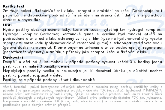 Zmírňuje bolest, škrábání/pálení v krku, chrapot a dráždění na kašel. Doporučuje se i pacientům s chronickým post-radiačním zánětem na sliznici ústní dutiny a s poruchou činnosti slinných žláz.