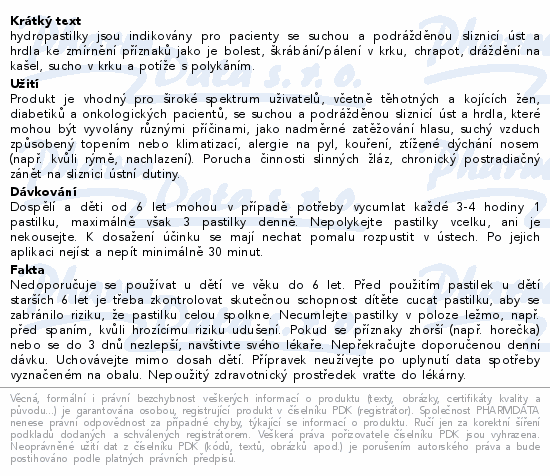 hydropastilky jsou indikovány pro pacienty se suchou a podrážděnou sliznicí úst a hrdla ke zmírnění příznaků jako je bolest, škrábání/pálení v krku, chrapot, dráždění na kašel, sucho v krku a potíže s polykáním.