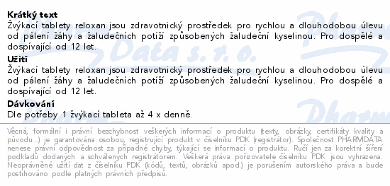 Žvýkací tablety reloxan jsou zdravotnický prostředek pro rychlou a dlouhodobou úlevu od pálení žáhy a žaludečních potíží způsobených žaludeční kyselinou. Pro dospělé a dospívající od 12 let.