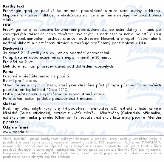 FreeAngin sprej se používá ke zmírnění podrážděné sliznice ústní dutiny a hltanu. Napomáhá k udržení vlhkosti a elastičnosti sliznice a zmírňuje nepříjemný pocit bolesti v krku.