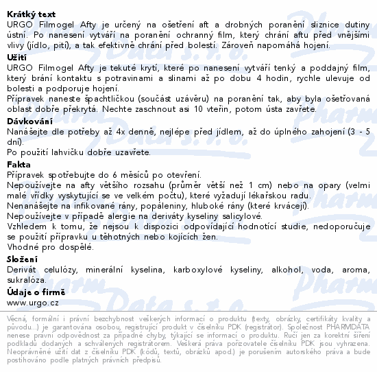 URGO Filmogel Afty je určený na ošetření aft a drobných poranění sliznice dutiny ústní. Po nanesení vytváří na poranění ochranný film, který chrání aftu před vnějšími vlivy (jídlo, pití), a tak efektivně chrání před bolestí. Zároveň napomáhá hojení.