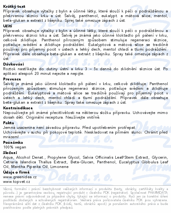 Přípravek obsahuje výtažky z bylin a účinné látky, které slouží k péči o podrážděnou a překrvenou sliznici krku a úst. Šalvěj, panthenol, eukalypt. a mátová silice, mentol, beta-glukan a extrakt z lišejníku. Sprej také omezuje zápach z úst.