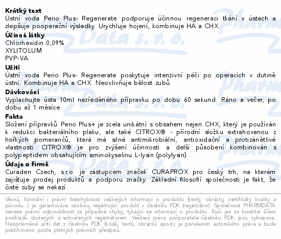 Ústní voda Perio Plus- Regenerate podporuje účinnou regeneraci tkání v ústech a zlepšuje pooperační výsledky. Urychluje hojení, kombinuje HA a CHX.