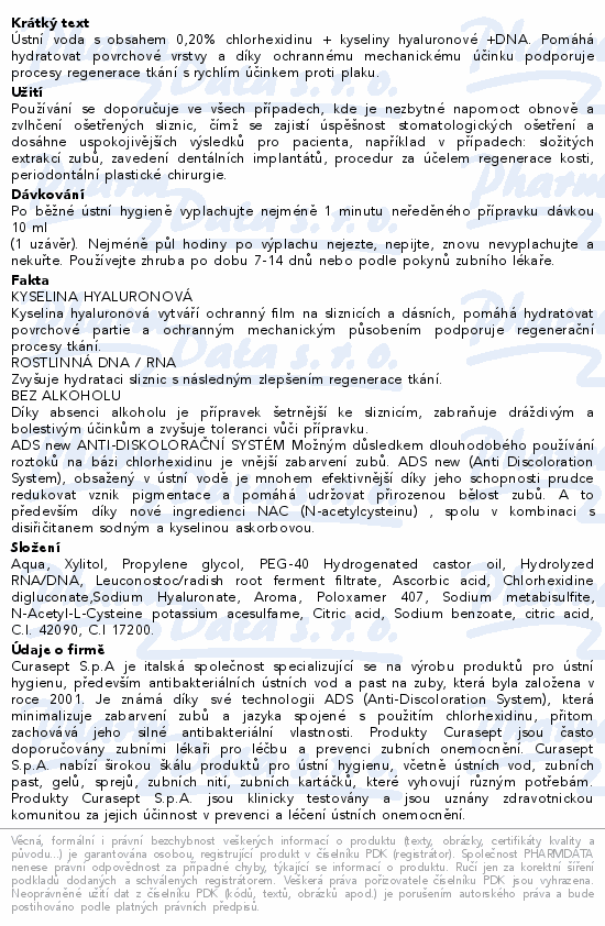 Ústní voda s obsahem 0,20% chlorhexidinu + kyseliny hyaluronové +DNA. Pomáhá hydratovat povrchové vrstvy a díky ochrannému mechanickému účinku podporuje procesy regenerace tkání s rychlím účinkem proti plaku.
