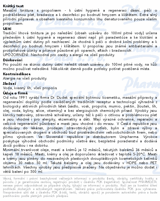 Masážní tinktura s propolisem - k ústní hygieně a regeneraci dásní, péči o podrážděnou pleť, bradavice a k dezinfekci po bodnutí hmyzem a klíštětem. Extra silný přírodní přípravek s obsahem kvasného konzumního lihu denaturovaného pouze včelím propolisem.