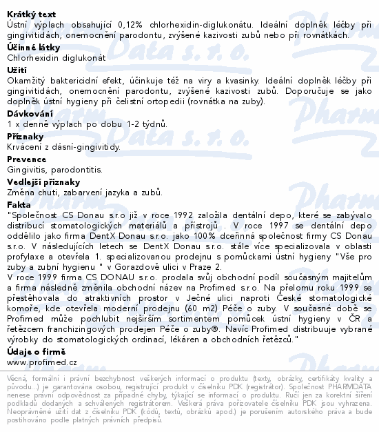 Ústní výplach obsahující 0,12% chlorhexidin-diglukonátu. Ideální doplněk léčby při gingivitidách, onemocnění parodontu, zvýšené kazivosti zubů nebo při rovnátkách.