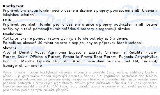 Přípravek pro akutní lokální péči o dásně a sliznice s projevy podráždění a aft. Určena k lokálnímu ošetření.
