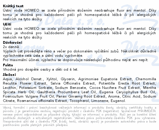 Ústní voda HOMEO se zcela přírodním složením neobsahuje fluor ani mentol. Díky tomu je vhodná pro každodenní péči při homeopatické léčbě či při alergických reakcích na tyto složky.