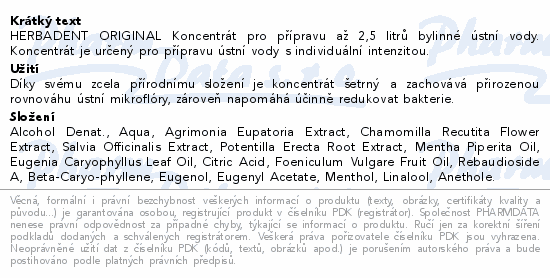 HERBADENT ORIGINAL Koncentrát pro přípravu až 2,5 litrů bylinné ústní vody. Koncentrát je určený pro přípravu ústní vody s individuální intenzitou.