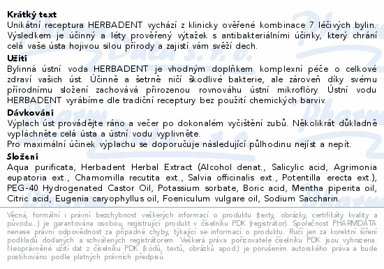Unikátní receptura HERBADENT vychází z klinicky ověřené kombinace 7 léčivých bylin. Výsledkem je účinný a léty prověřený výtažek s antibakteriálními účinky, který chrání celá vaše ústa hojivou silou přírody a zajistí vám svěží dech.