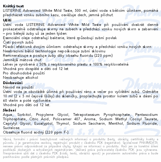 LISTERINE Advanced White Mild Taste, 500 ml, ústní voda s bělicím účinkem, pomáhá předcházet vzniku zubního kazu, osvěžuje dech, jemná příchuť.