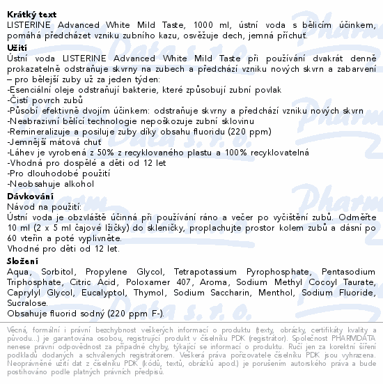 LISTERINE Advanced White Mild Taste, 1000 ml, ústní voda s bělicím účinkem, pomáhá předcházet vzniku zubního kazu, osvěžuje dech, jemná příchuť.