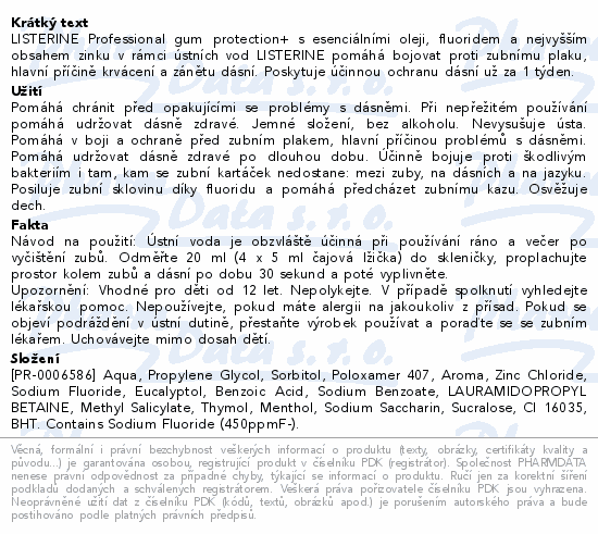 LISTERINE Professional gum protection+ s esenciálními oleji, fluoridem a nejvyšším obsahem zinku v rámci ústních vod LISTERINE pomáhá bojovat proti zubnímu plaku, hlavní příčině krvácení a zánětu dásní. Poskytuje účinnou ochranu dásní už za 1 týden.