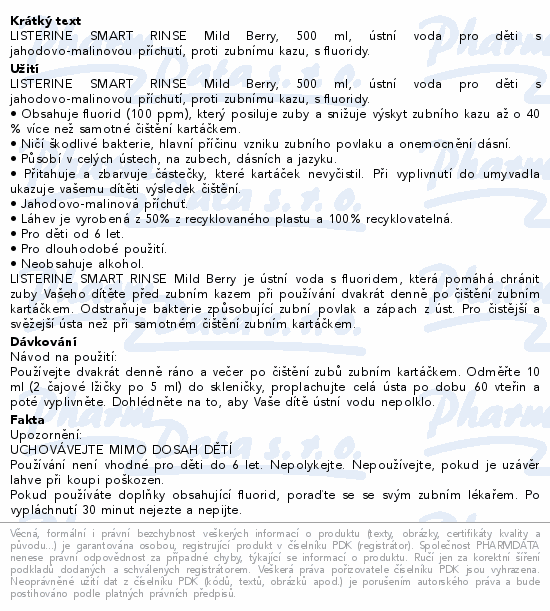LISTERINE SMART RINSE Mild Berry, 500 ml, ústní voda pro děti s jahodovo-malinovou příchutí, proti zubnímu kazu, s fluoridy.