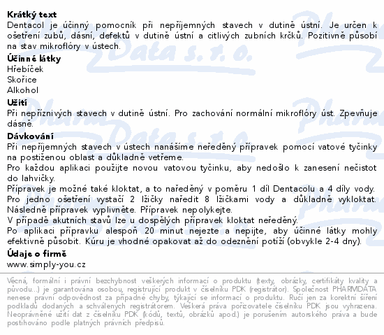 Dentacol je účinný pomocník při nepříjemných stavech v dutině ústní. Je určen k ošetření zubů, dásní, defektů v dutině ústní a citlivých zubních krčků. Pozitivně působí na stav mikroflóry v ústech.