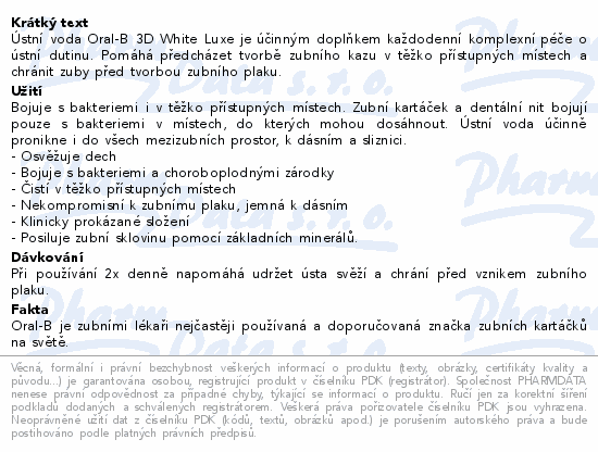 Ústní voda Oral-B 3D White Luxe je účinným doplňkem každodenní komplexní péče o ústní dutinu. Pomáhá předcházet tvorbě zubního kazu v těžko přístupných místech a chránit zuby před tvorbou zubního plaku.