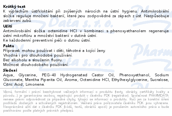 K výplachům úst/kloktání při zvýšených nárocích na ústní hygienu. Antimikrobiální složka reguluje množení bakterií, které jsou zodpovědné za zápach z úst. Nezpůsobuje zabarvení zubů. Podpůrná péče při léčbě zánětů v dutině ústní.