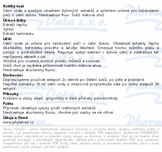 Ústní voda s vysokým obsahem bylinných extraktů a xylitolem určená pro každodenní péči o ústní dutinu. Neobsahuje fluor. Svěží mátová chuť.