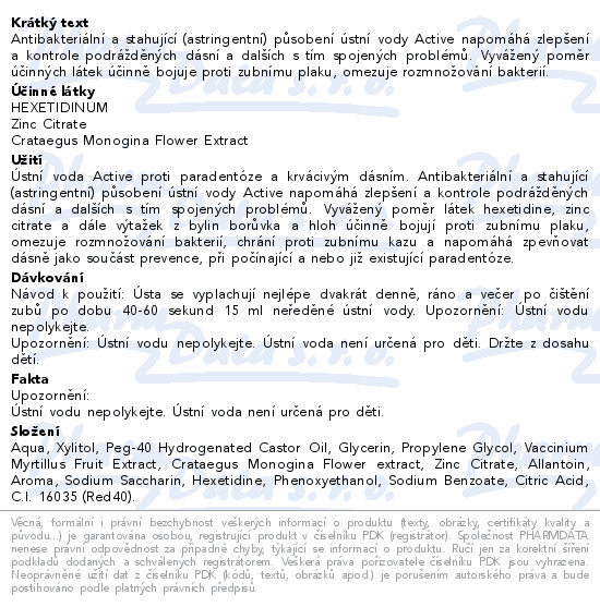 Antibakteriální a stahující (astringentní) působení ústní vody Active napomáhá zlepšení a kontrole podrážděných dásní a dalších s tím spojených problémů. Vyvážený poměr účinných látek účinně bojuje proti zubnímu plaku, omezuje rozmnožování bakterií.