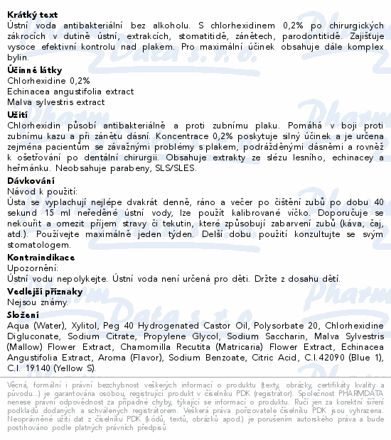 Ústní voda antibakteriální bez alkoholu. S chlorhexidinem 0,2% po chirurgických zákrocích v dutině ústní, extrakcích, stomatitidě, zánětech, parodontitidě. Zajišťuje vysoce efektivní kontrolu nad plakem. Pro maximální účinek obsahuje dále komplex bylin.