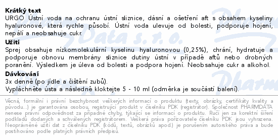 URGO Ústní voda na ochranu ústní sliznice, dásní a ošetření aft s obsahem kyseliny hyaluronové, která rychle působí. Ústní voda ulevuje od bolesti, podporuje hojení, nepálí a neobsahuje cukr.