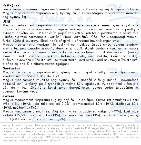 Leros Vánoční lékárna magus medicament obsahuje 2 druhy sypaných čajů a to Leros Magus medicament respiratus 60g bylinný čaj a Leros Magus medicament imunitae 45g bylinný čaj.