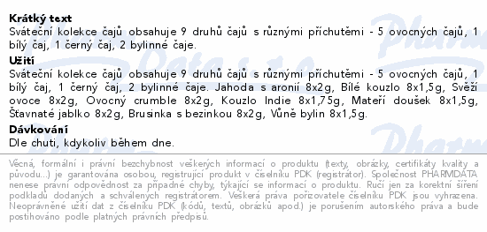 Sváteční kolekce čajů obsahuje 9 druhů čajů s různými příchutěmi - 5 ovocných čajů, 1 bílý čaj, 1 černý čaj, 2 bylinné čaje.