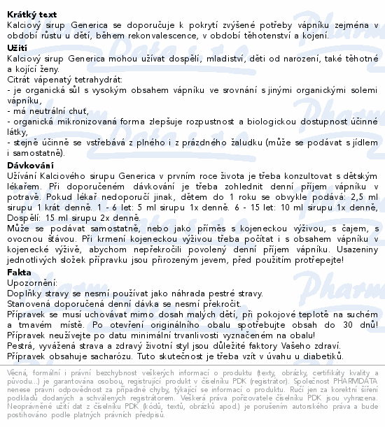 Kalciový sirup Generica se doporučuje k pokrytí zvýšené potřeby vápníku zejména v období růstu u dětí, během rekonvalescence, v období těhotenství a kojení.