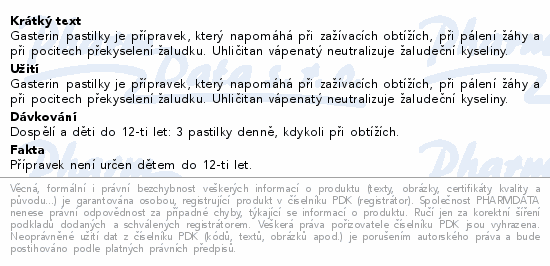 Gasterin pastilky je přípravek, který napomáhá při zažívacích obtížích, při pálení žáhy a při pocitech překyselení žaludku. Uhličitan vápenatý neutralizuje žaludeční kyseliny.