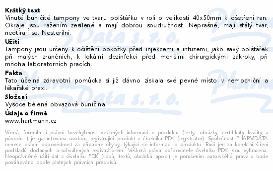 Vinuté buničité tampony ve tvaru polštářku v roli o velikosti 40x50mm k ošetření ran. Okraje jsou ražením zesílené a mají dobrou soudružnost. Neprašné, mají stálý tvar, neotírají se. Nesterilní.