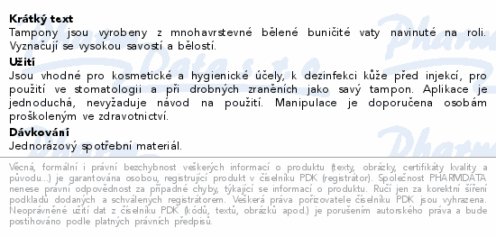 Tampony jsou vyrobeny z mnohavrstevné bělené buničité vaty navinuté na roli. Vyznačují se vysokou savostí a bělostí.