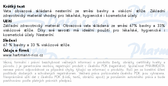 Vata obvazová skládaná nesterilní ze směsi bavlny a viskózní střiže. Základní zdravotnický materiál vhodný pro lékařské, hygienické i kosmetické účely.