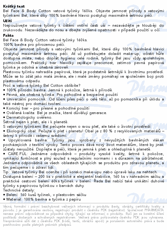 Bel Face & Body Cotton vatové tyčinky 160ks. Objevte jemnost přírody s vatovými tyčinkami Bel, které díky 100% bavlněné hlavici poskytují maximálně šetrnou péči.