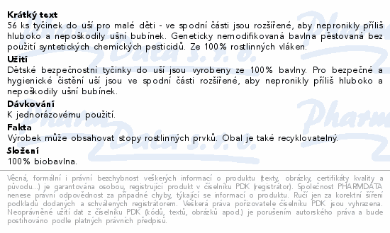 56 ks tyčinek do uší pro malé děti - ve spodní části jsou rozšířené, aby nepronikly příliš hluboko a nepoškodily ušní bubínek. Geneticky nemodifikovaná bavlna pěstovaná bez použití syntetických chemických pesticidů. Ze 100% rostlinných vláken.
