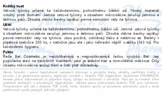 Vatové tyčinky určené ke každodennímu, pohodlnému čištění uší. Nosný materiál odolný proti zlomení. Jemné vatové tyčinky s obsahem mikrovlákna zaručují jemnou a šetrnou péči. Dlouhá vlákna bavlny zajišťují pevné namotání vaty na tyčince.