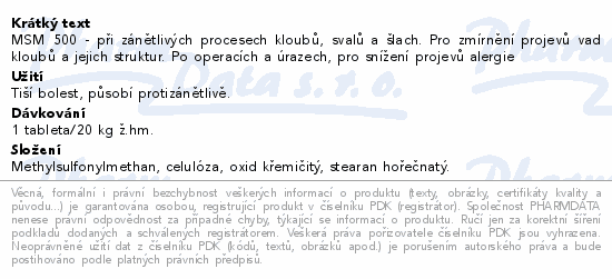 MSM 500 - při zánětlivých procesech kloubů, svalů a šlach. Pro zmírnění projevů vad kloubů a jejich struktur. Po operacích a úrazech, pro snížení projevů alergie