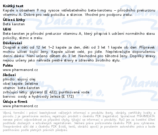 Bioaktivní Karoten cps. 150 je doplněk stravy s obsahem přírodního beta-karotenu, což je provitamin, který se přeměňuje na vitamin A v množství, které tělo potřebuje. Vitamin A přispívá k udržení normálního stavu pokožky, sliznic a zraku, podporuje normální funkci imunitního systému a přispívá ke správnému metabolismu železa. Beta-karoten je také antioxidant, který pomáhá chránit buňky před oxidativním stresem. Přípravek Bioaktivní karoten využívá technologii postupného uvolňování, což přispívá k lepší vstřebatelnosti a využití beta-karotenu v těle. Pro optimální vstřebávání v těle se doporučuje užívat kapsle během jídla. Studie dokonce dokládají, že beta-karoten ve formě doplňku stravy má lepší biologickou dostupnost, než když se získává konzumací zeleniny (listová zelenina, brokolice, mrkev, kapie, dýně, meruňky). Kapsle Bioaktivní Karoten je často vyhledáván v období zvýšeného slunečního záření, kdy lidé dbají na podporu přirozeného zbarvení pokožky. Upozornění: není vhodný pro těhotné ženy a kuřáky. U silných kuřáků je u vysokých dávek beta-karotenu teoretické riziko, že může mít prokarcinogenní účinky, proto by se silní kuřáci měli o užívání beta-karotenu poradit s lékařem.