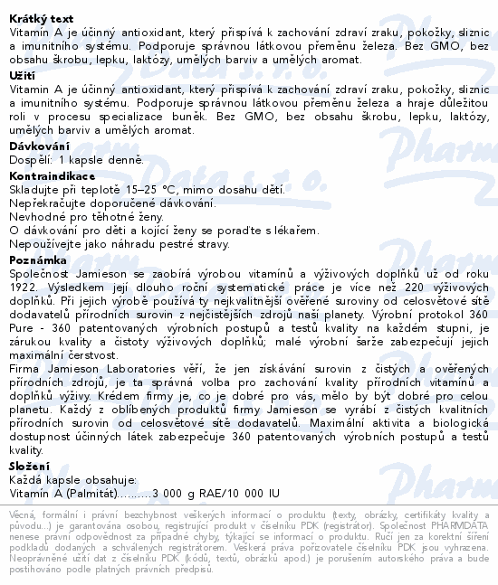 Vitamín A je účinný antioxidant, který přispívá k zachování zdraví zraku, pokožky, sliznic a imunitního systému. Podporuje správnou látkovou přeměnu železa. Bez GMO, bez obsahu škrobu, lepku, laktózy, umělých barviv a umělých aromat.
