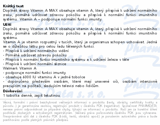 Doplněk stravy Vitamin A MAX obsahuje vitamin A, který přispívá k udržení normálního zraku, pomáhá udržovat zdravou pokožku a přispívá k normální funkci imunitního systému. Vitamín A – podporuje normální funkci imunity.