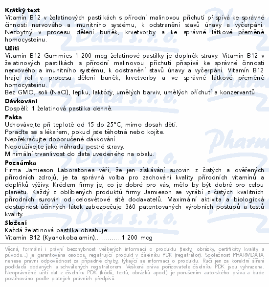 Vitamín B12 v želatinových pastilkách s přírodní malinovou příchutí přispívá ke správné činnosti nervového a imunitního systému, k odstranění stavů únavy a vyčerpání. Nezbytný v procesu dělení buněk, krvetvorby a ke správné látkové přeměně homocysteinu.