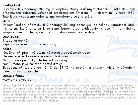 Přípravek B17 therapy 500 mg je doplněk stravy s účinným složením. Látka B17 byla představena odborné veřejnosti biochemikem Ernstem T. Krebsem ml. v roce 1950. Tato látka v současné době zajímá onkology z celého světa.