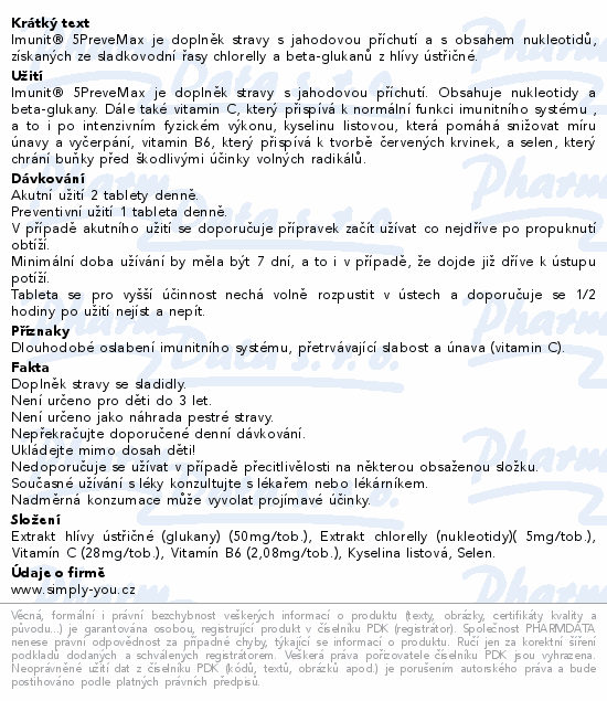 Imunit® 5PreveMax je doplněk stravy s jahodovou příchutí a s obsahem nukleotidů, získaných ze sladkovodní řasy chlorelly a beta-glukanů z hlívy ústřičné.