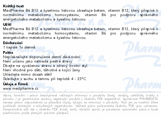 MedPharma B6 B12 a kyselinou listovou obsahuje betain, vitamin B12, který přispívá k normálnímu metabolizmu homocysteinu, vitamin B6 pro podporu správného energetického metabolizmu a kyselinu listovou.