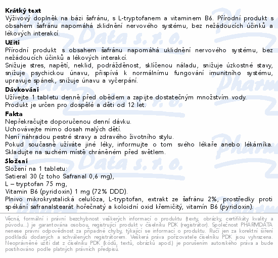 Výživový doplněk na bázi šafránu, s L-tryptofanem a vitaminem B6. Přírodní produkt s obsahem šafránu na zklidnění nervového systému, bez nežádoucích účinků a lékových interakcí.